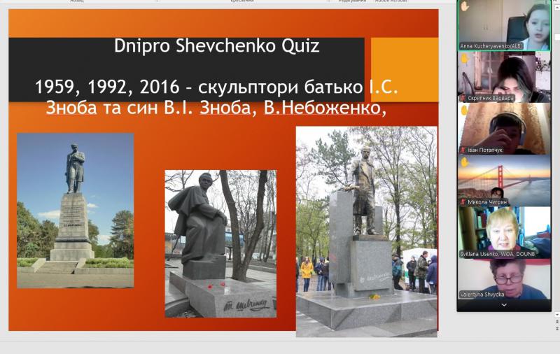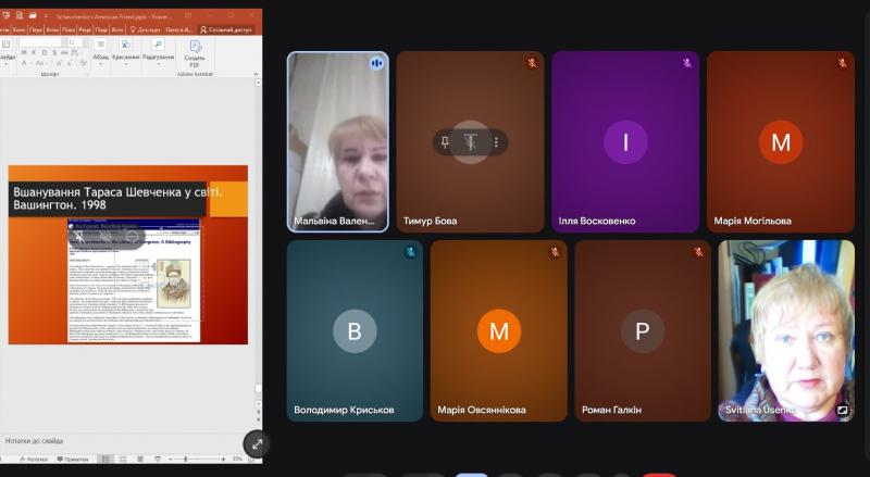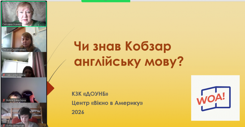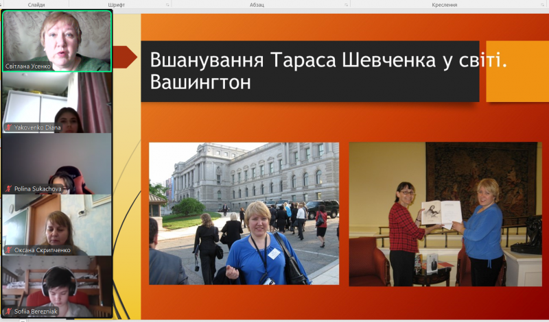 До дня народження Тараса Григоровича Шевченка (на відзначення 212 річниці від д. р.), засобами додатку Google Meet бібліотекарка, керівниця інформаційно-ресурсного центру «Вікно в Америку», Світлана Усенко зустрілася зі студентами (спеціальності ЦЖ, ВТЗ, ЕС) під час виховної години у бібліотеці ДФМХК. Метою зустрічі було заохотити молодь вивчати англійську мову, американську історію і культуру та популяризувати у світі Україну та її митців англійською мовою. А ще дізнатися відповідь на інтригуєче питання «Чи знав Кобзар англійську мову?»Повніше