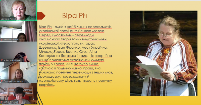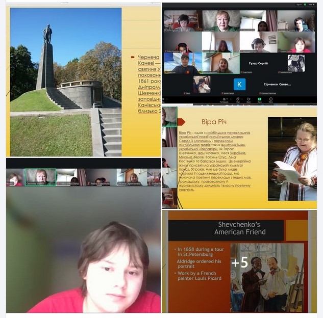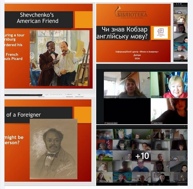 «Чи знав Кобзар англійську мову?»Напередодні шевченківського свята для школярів Ліцею №22 ДМР відбулося 4 zoom-зустрічі, які представниця Дніпропетровської обласної наукової бібліотеки ім. Первоучителів слов’янських Кирила і Мефодія та керівник інформаційно-ресурсного центру «Вікно в Америку» Світлана Усенко використала для заохочення молоді вивчати англійську мову, американську історію і культуру, популяризувати у світі Україну та її митців англійською.Старші учні по-новому, використовуючи засоби мистецтва, поглянули на відомі факти з біографії видатного художника і поета Тараса Григоровича Шевченка. Дізналися про знайомство поета з американським актором Айрою Олдріджем у 1858 році, побачили та дали художній аналіз портрету актора, який намалював Тарас Шевченко. Маємо спогади сучасників про моменти створення портрету, про їх спілкування один з одним через перекладача. ПовнішеБританка Віра Річ визнана найкращою перекладачкою поезії Тараса