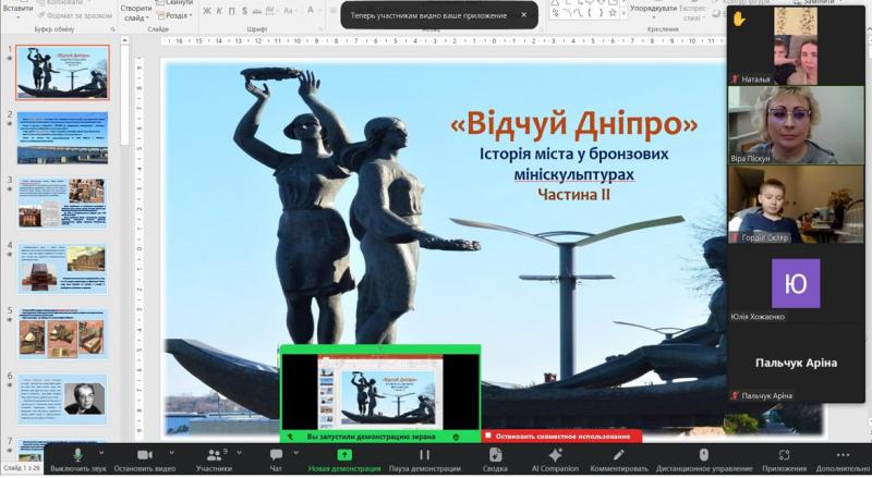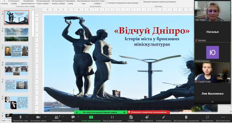 В межах спільного проєкту Відділ наукової інформації та бібліографії разом із Дніпровським ліцеєм №1 Дніпровської міської ради продовжує цикл тематичних зустрічей з молоддю. Шкільні канікули – час подорожей, хай навіть і віртуальних. Ліцеїсти середніх класів та їх батьки під час чергової інформаційно-пізнавальної зустрічі за допомогою презентації у двох частинах «Відчуй Дніпро»: Історія міста у бронзових мініскульптурах» помандрували рідним містом і познайомилися з історією міста, яка відтворена у бронзових мініскульптурах, що присвячені видатним особистостям чи значущим подіям: «Міст Олександра Поля», «Дніпровський диригент Гурген Карапетян», «Марафонець Дніпра», «Здобне печиво Дніпро», «Дніпровський трамвай», «Залікова книжка студента», «Фанат Дніпра», «Дніпровська ракета», «Катеринославська цегла», «Кіт Василь», «Пилосос «Ракета», «Муза митця Вадима Сідура», «Лікарська валіза Івана Лєшко-Попеля», «Дніпровські лоцмани» - гордість і слава нашого міста. Під час перегляду підлітки із задоволенням роздивлялися мініатюри, слухали історичні розвідки та відшукували маленьких котиків, що супроводжують кожні із мініатюр. Тож канукули у розпалі і на нас чекають нові зустрічі.
