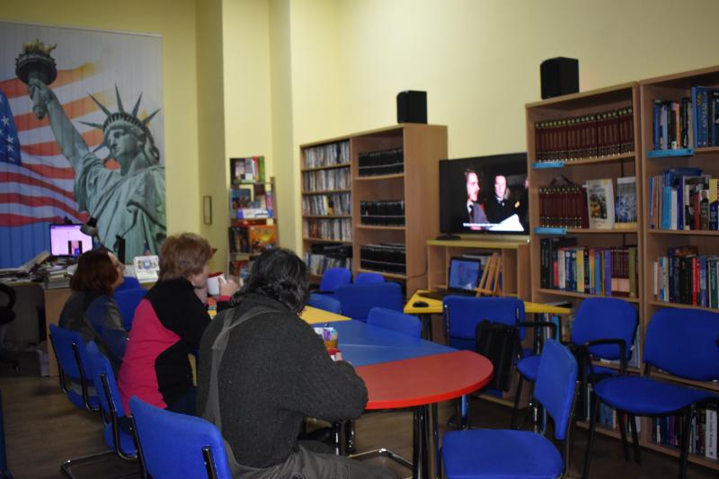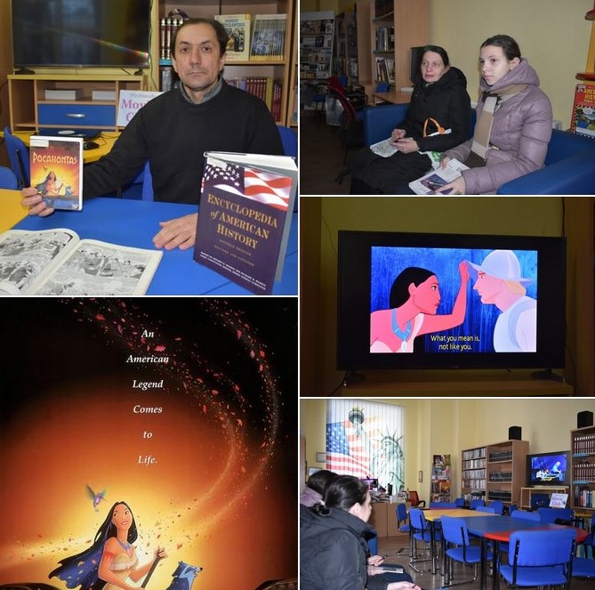 Члени кіноклубу в центрі «Вікно в Америку» переглядали мультфільм компанії «Дісней» «Покахонтас» (1995). Це не складний підручник історії гортати, це романтична історія – привід для розмови про історію, культуру та міфи Північної Америки, про початок створення поселень європейцями. У центрі історії – Покахонтас, донька вождя індіанського племені, і англієць Джон Сміт. Їхня дружба (у фільмі романтична) показує як страх і жадібність руйнують мир, а спроба слухати й намагатися зрозуміти індіанців – рятує їх. Події, зображені у фільмі, відбуваються близько 1607 року, з початку заснування Джеймстауну (Вірджінія) та перших контактів між європейцями та корінними племенами Північної Америки.
