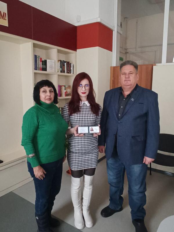 У відділі читальних залів з приємністю разом із заступником голови правління Дніпропетровська обласна організація НСПУ Еліною Заржицькою вручили у піднесеній атмосфері спілчанській квиток новий членкині талановитій поетесі Анні Щербак. Це вже добра традиція, котра склался у товаристві січеславських літераторів. Показово що привітати новоприбулу поетку прийшли вже її творчі вихованці.