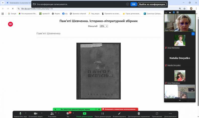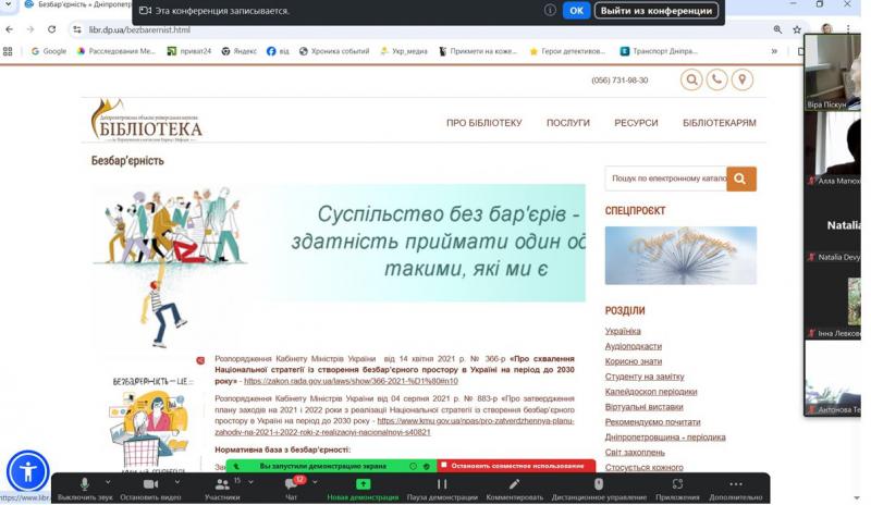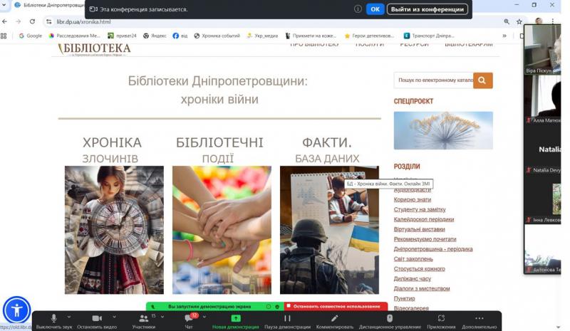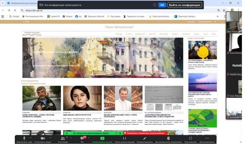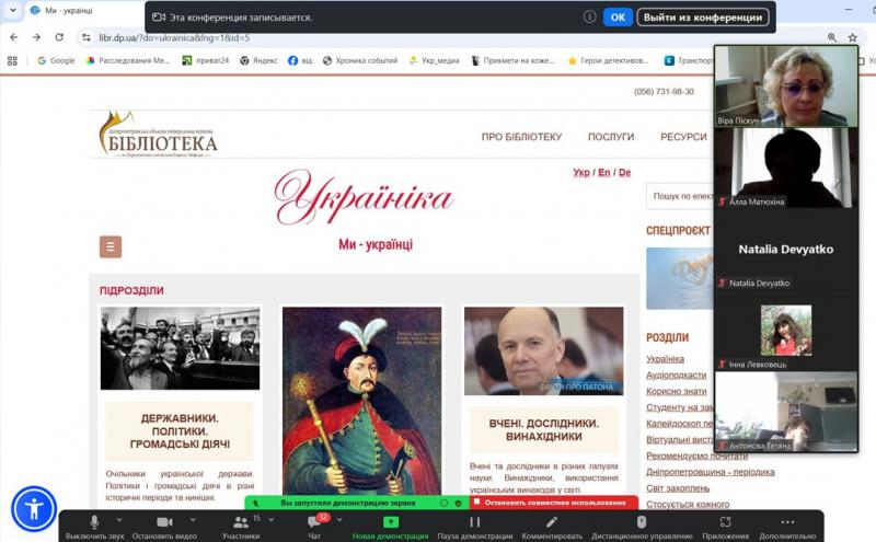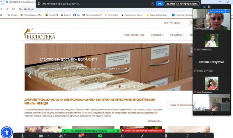 Авторський курс Наталії Володимирівни Дев’ятко, доцентки кафедри філософії Дніпровської академії неперервної освіті, кандидатки філософських наук, членкині НСПУ та НСЖУ став частиною роботи проєкту «Освіта онлайн», започаткованого Дніпропетровською обласною універсальною науковою бібліотекою спільно з Академією неперервної освіти. В межах другої он-лайн зустрічі з освітянами області загалу були представлені інформаційні та сервісні можливості ДОУНБ, а саме: можливості пошуку в електронному каталозі ДОУНБ https://www.libr.dp.ua/; повнотекстові ресурси бібліотеки, представлені оцифрованими виданнями загального та краєзнавчого фондів, можливість отримати відповідь через віртуальну довідку https://www.libr.dp.ua/?do=virtb, відео-доробок бібліотеки https://www.youtube.com/user/dounbkm, сторінки бібліотеки у соціальних мережах https://www.libr.dp.ua/Socmerezhi.html, матеріалами з історії і сучасного розвитку Придніпровського краю на порталі «ДніпроКультура https://www.dnipro.libr.dp.ua/. Детально був представлений розділ сайту «Україніка» https://www.libr.dp.ua/?do=ukrainica як корисний ресурс для учнів та вчителів, проєкт бібліотеки «Аудіоподкасти» https://www.libr.dp.ua/86-audopodkasti.html. Також було представлено «Календар знаменних та пам'ятних дат на 2026 рік», який є гарним засобом при формуванні та проведені позашкільних заходів.