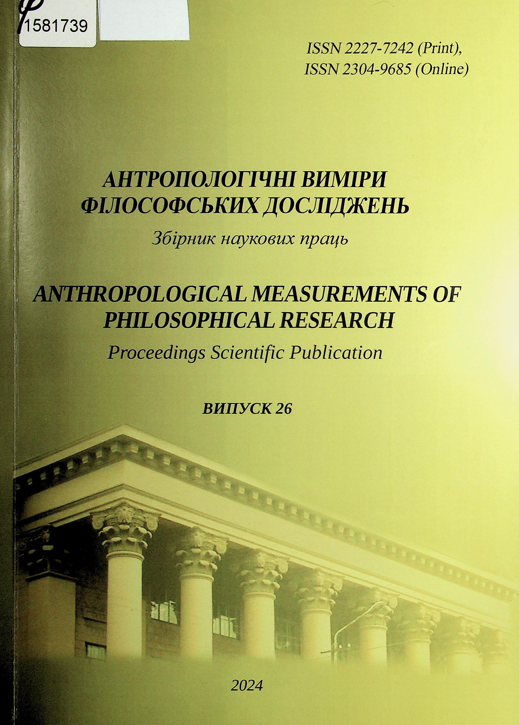 Антропологічні виміри філософських досліджень = Anthropological measurements of philosophical research : зб. наук. праць. Вип. 26 / Укр. держ. ун-т науки і технологій ; ред. В. В. Хміль [та ін.]. - Дніпро : [б. в.], 2024. - 159 с.