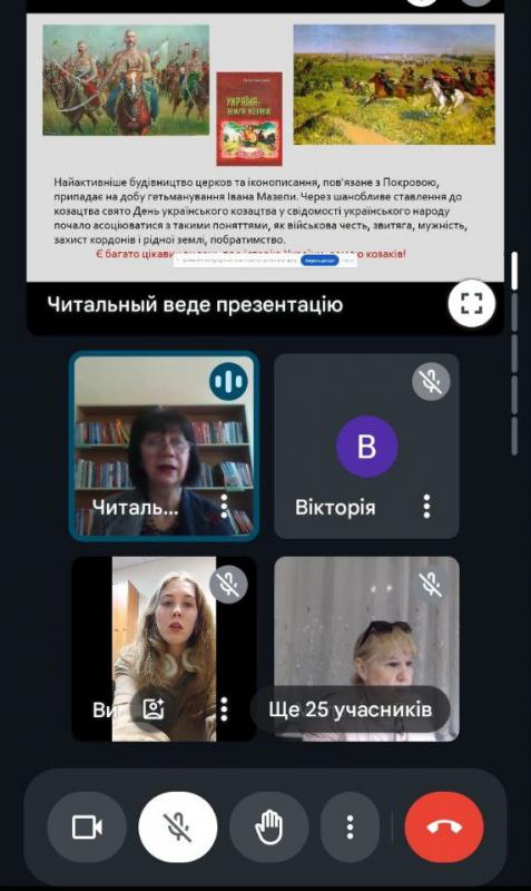 | Приречені на Перемогу! Патріотична онлайн-година з такої теми організована для студентської молоді Dnipro Art College. Користувачі дізналися про історію свята – Дня захисників і захисниць України, про сучасну традицію військового товариства, яка суттєво впливає на згуртованість і боєздатність захисників країни, активний розвиток волонтерського руху і як ці люди стали воїнами, помічниками та надійними захисниками Батьківщини, а їхня діяльність – зразком самовідданості та патріотизму. Захід підготували та провели фахівці відділу читальних залів Дніпропетровської обласної універсальної наукової бібліотеки ім. Первоучителів слов’янських Кирила і Мефодія. бул. Батальйону Дніпро, 10, м. Дніпро, 49006 https://www.libr.dp.ua/?do=chronicles&year=2024&idm=10