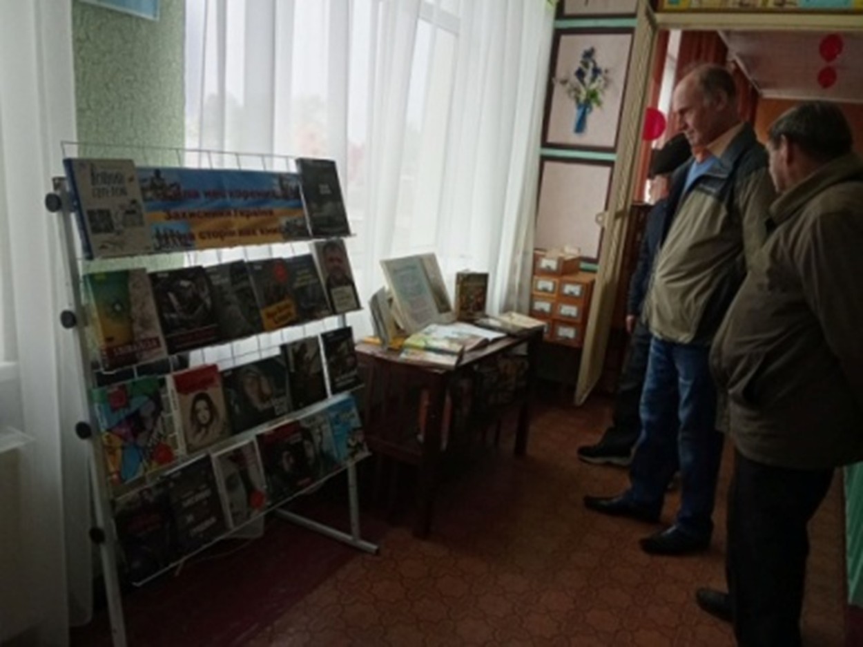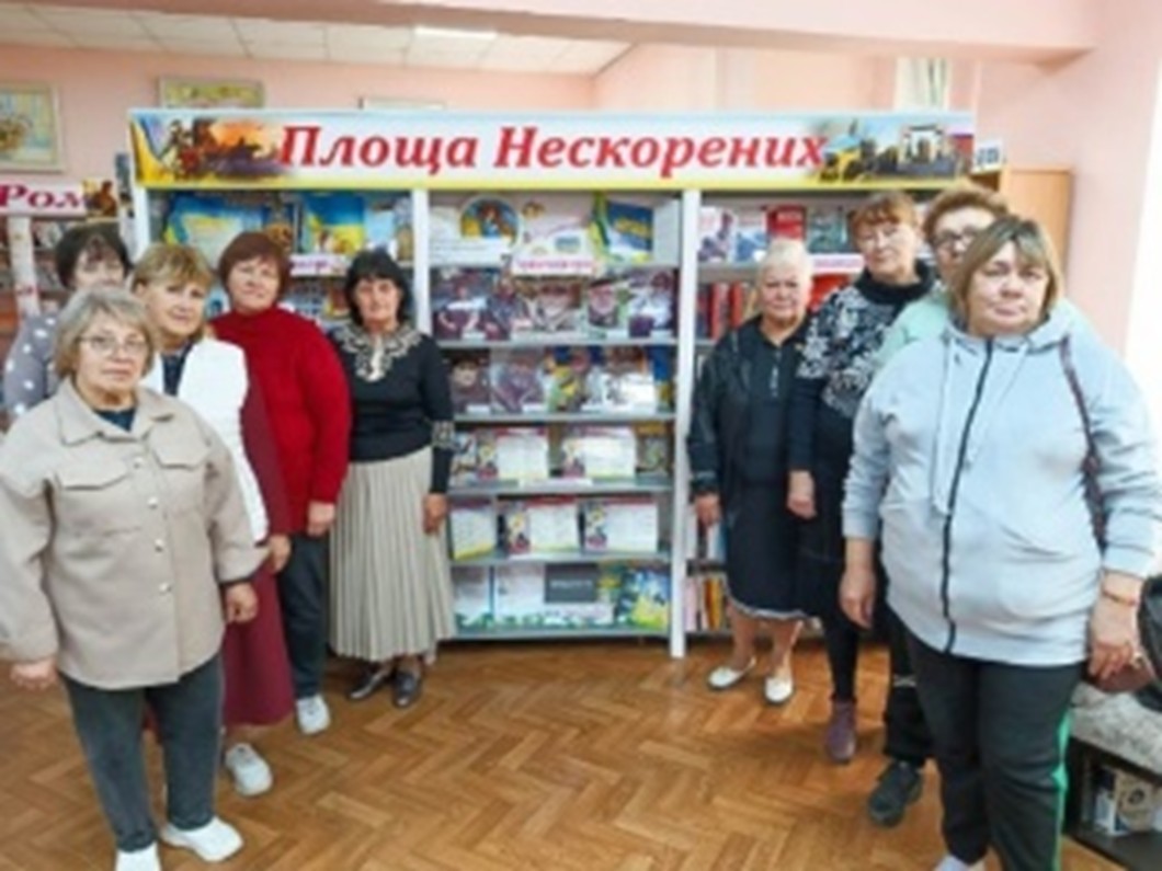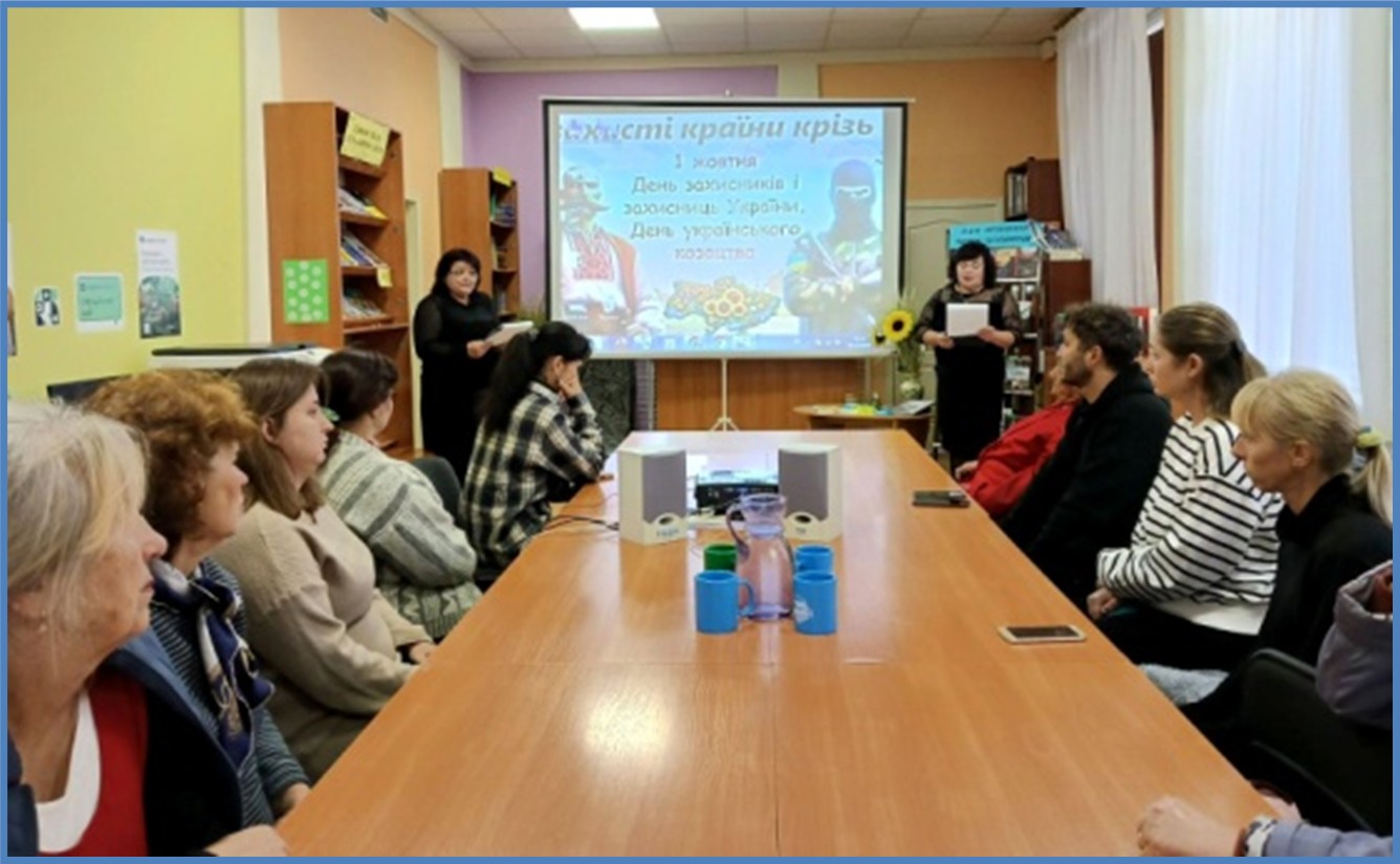 | Члени ГО «Турбота» у бібліотеці Читачі та фахівці бібліотеки зустрілися з членами ГО «Турбота», зустріч присвятили Дню захисників і захисниць України. Обговорювали книжкову виставку «Сила нескорених: Захисники України на сторінках книг». Виставка була створена з метою популяризації літератури і висвітлення матеріалів про історичне минуле та героїчне сьогодення України. Учасники ознайомилися з деякими книгами про сучасну війну, згадали про роль козацтва в історії української держави. Захід відбувся у філії «П’ятихатська міська бібліотека» КЗ «Центр культури і дозвілля» П’ятихатської міської ради (Кам’янський район). вул. Олександрійська, 65, м. П’ятихатки, Кам’янський район, 52100. https://www.libr.dp.ua/?do=dnipro&idp=1038