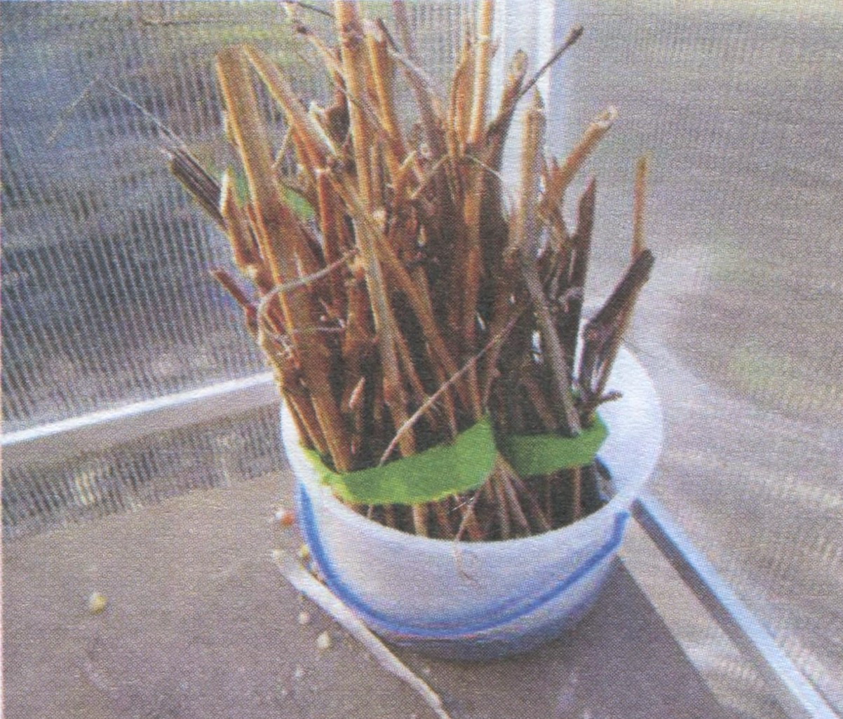 У банках почали зеленіти маленькі листочки. На 15-й день вузли на живцях збільшилися, кора навколо них почала тріскатися, а з тріщин пішли рости білі корінці. Ще більше корінців утворилося на двовічкових і тривічкових живцях там, де були зрізані бруньки. Борознування я не робив, оскільки вважаю зайвим наносити поздовжні рани, до того ж на них не виростають гарні корені. За моїми спостереженнями, найкращі корені ростуть на вузлах. На 18-й день усі 76 живців висадив у стаканчики діаметром 50 мм і заввишки 50 мм - для одновічкових, 100 мм - для двовічкових і 150 мм - для тривічкових. Усі живці мали гарні корінці завдовжки 15-20 мм. Один тривічковий живець був із гарними корінцями, але брунька не почала рости, однак я його також посадив - хотів подивитися, що з того вийде.