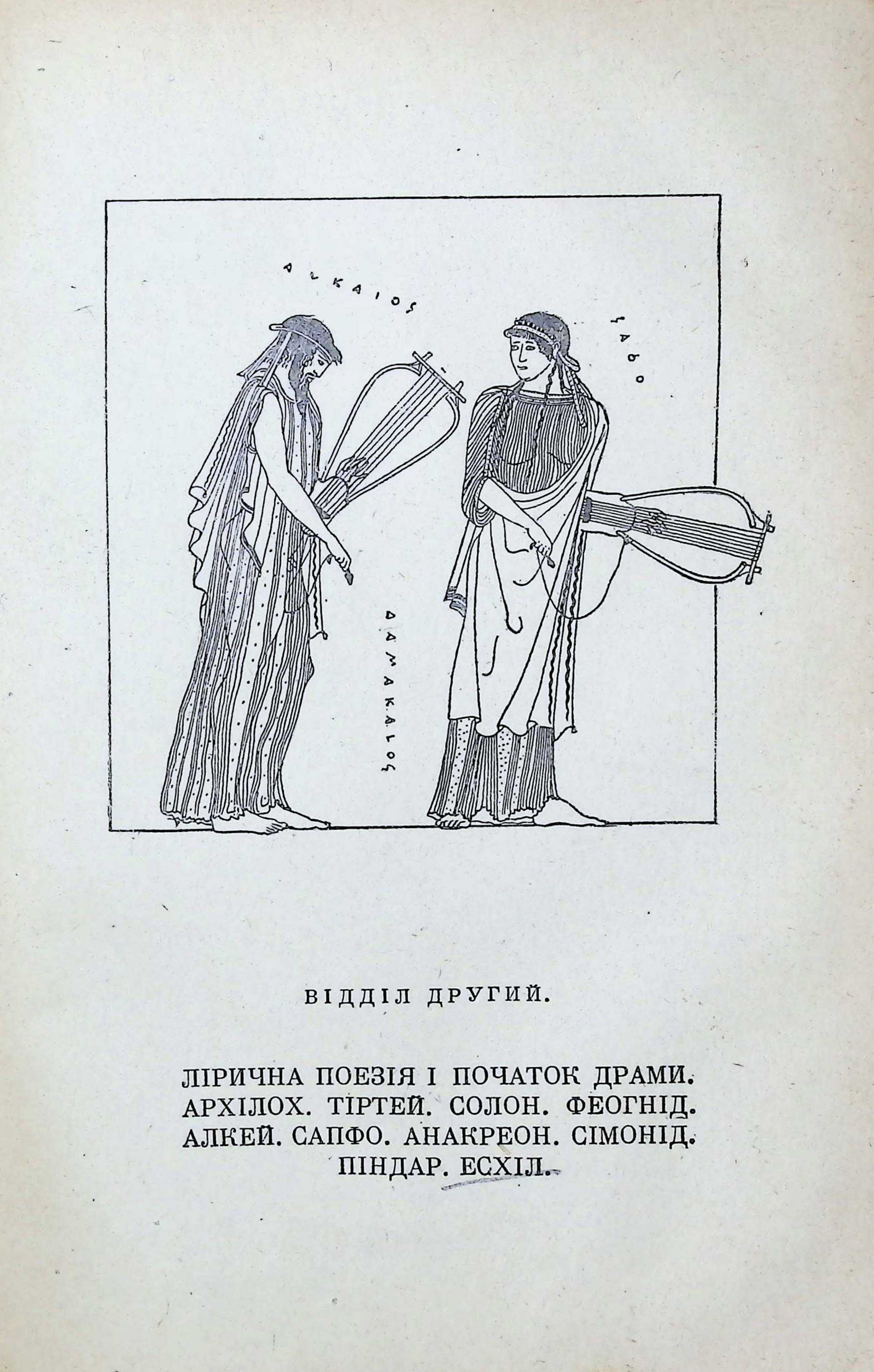 ВІДДІЛ ДРУГИЙ. ЛІРИЧНА ПОЕЗІЯ І ПОЧАТОК ДРАМИ. АРХІЛОХ. ТІРТЕЙ. СОЛОН. ФЕОГНІД.АЛКЕЙ. САПФО. АНАКРЕОН. СІМОНІД. ПІНДАР. ЕСХІЛ