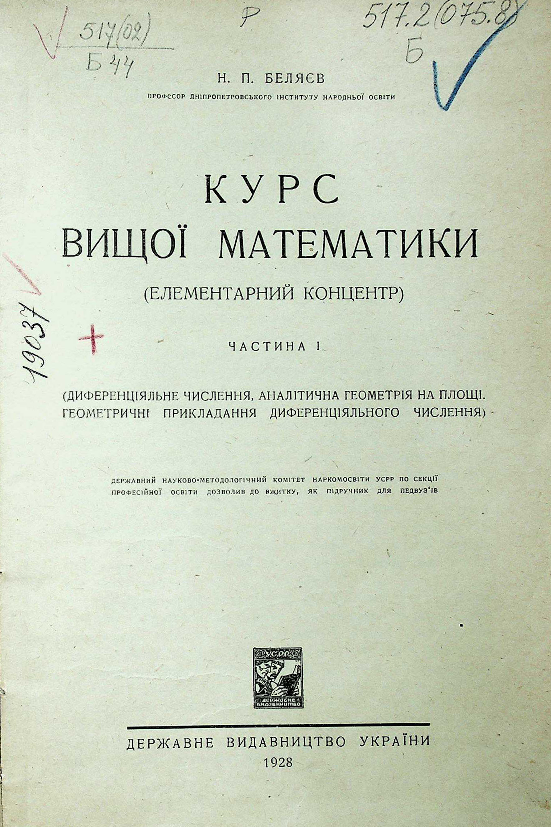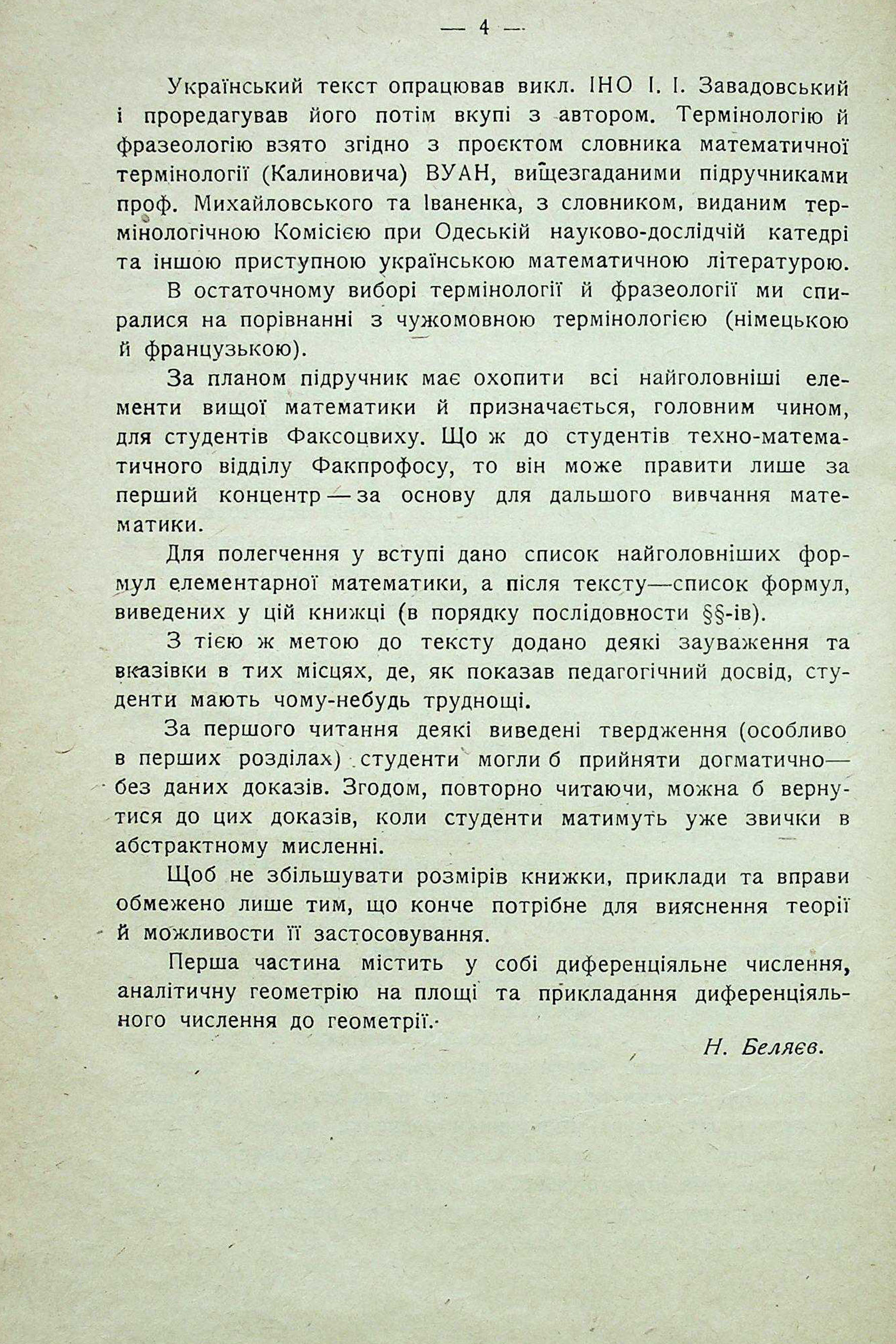 Н. П. БЕЛЯЄВ. КУРС ВИЩОЇ МАТЕМАТИКИ (ЕЛЕМЕНТАРНИЙ КОНЦЕНТР). ЧАСТИНА І