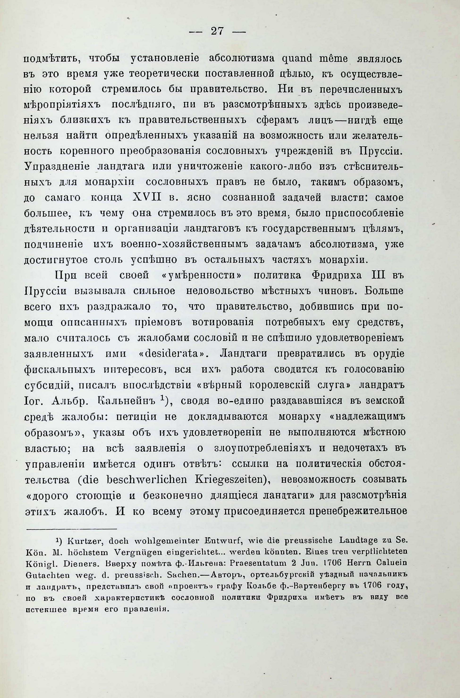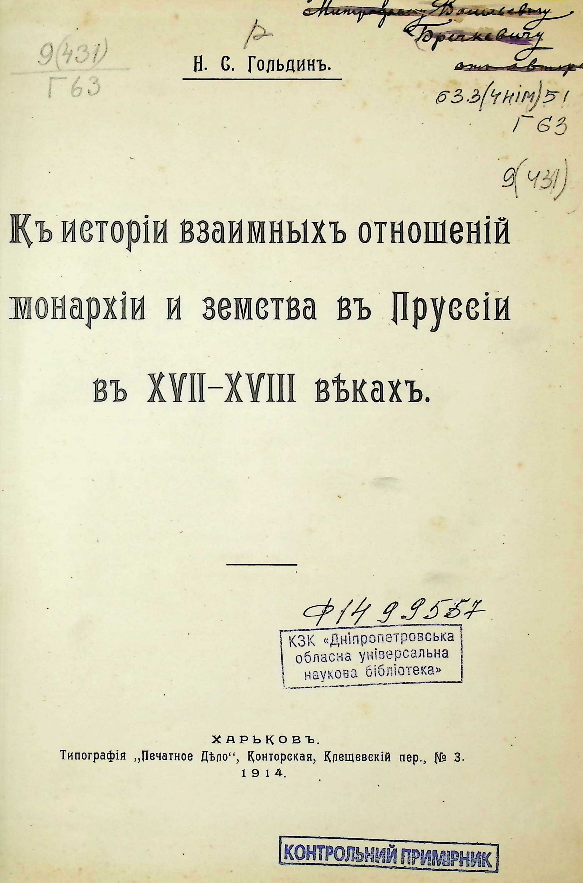 Н.С. Гольдинъ. Къ исторія взаимныхъ отношешй монархіи й земства въ Пруссіи въ ХVII-ХVIII векахъ