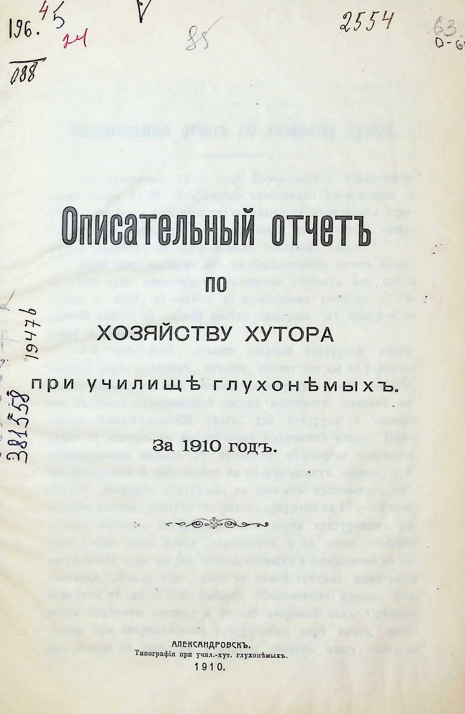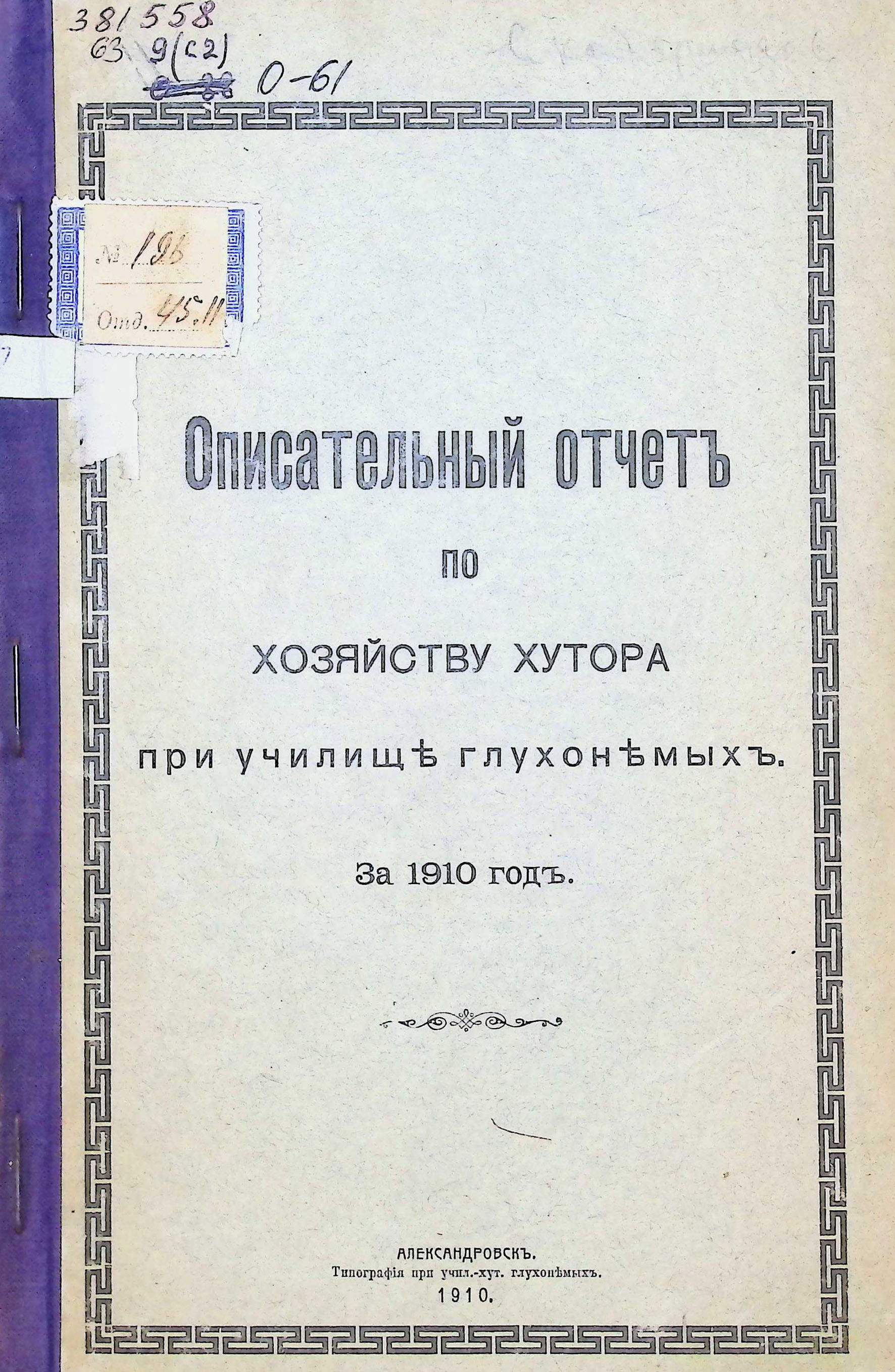 Описательный отчетъ по хозяйству хутора при училище глухонемыхъ . За 1910 годъ